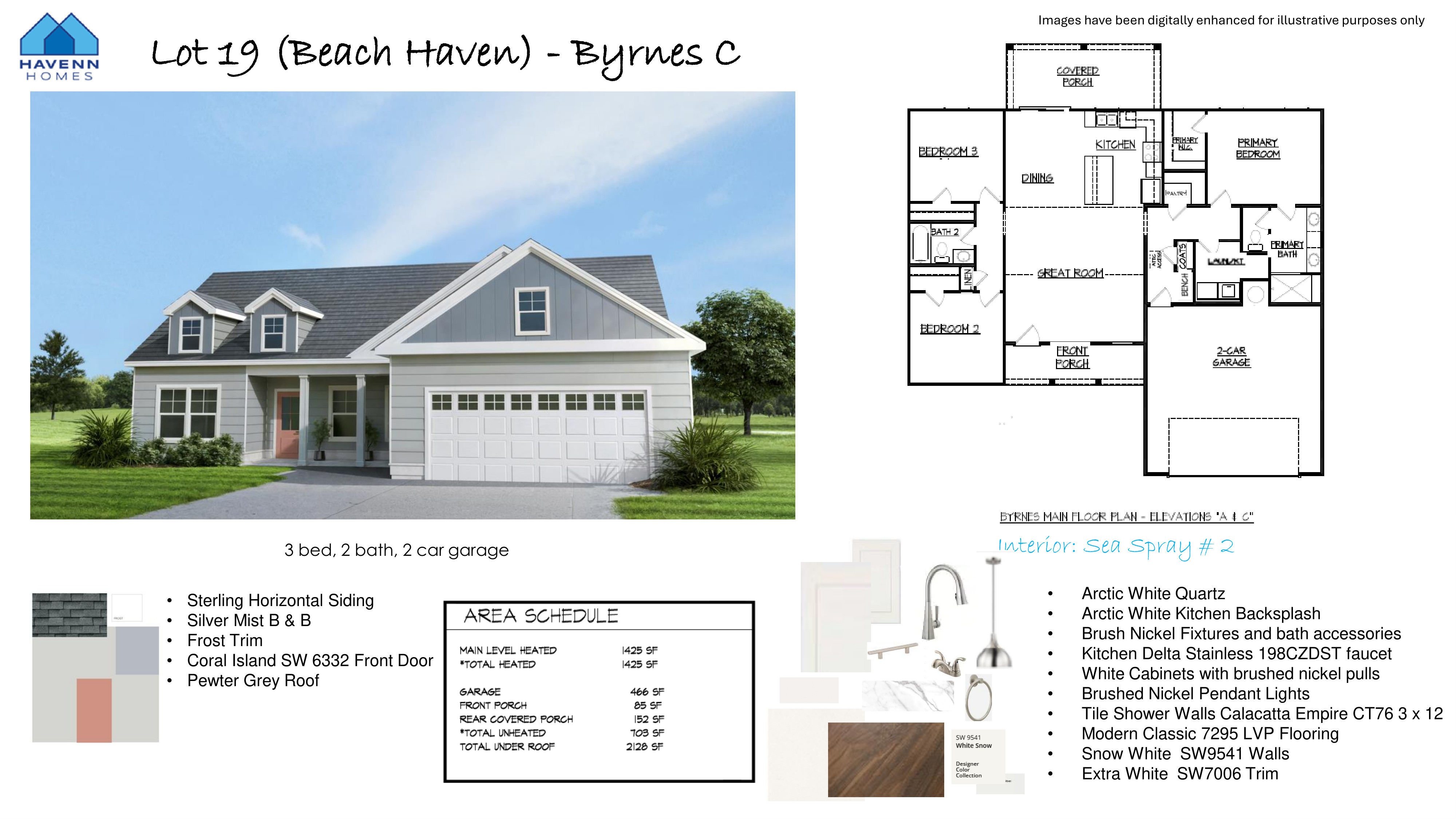 3 bedrooms, 2 bathrooms, 2-car garage, Sea Spray 2 interior, quartz countertops, white cabinetry, modern lighting, LVP flooring, and a coastal exterior with a coral-accented front door.