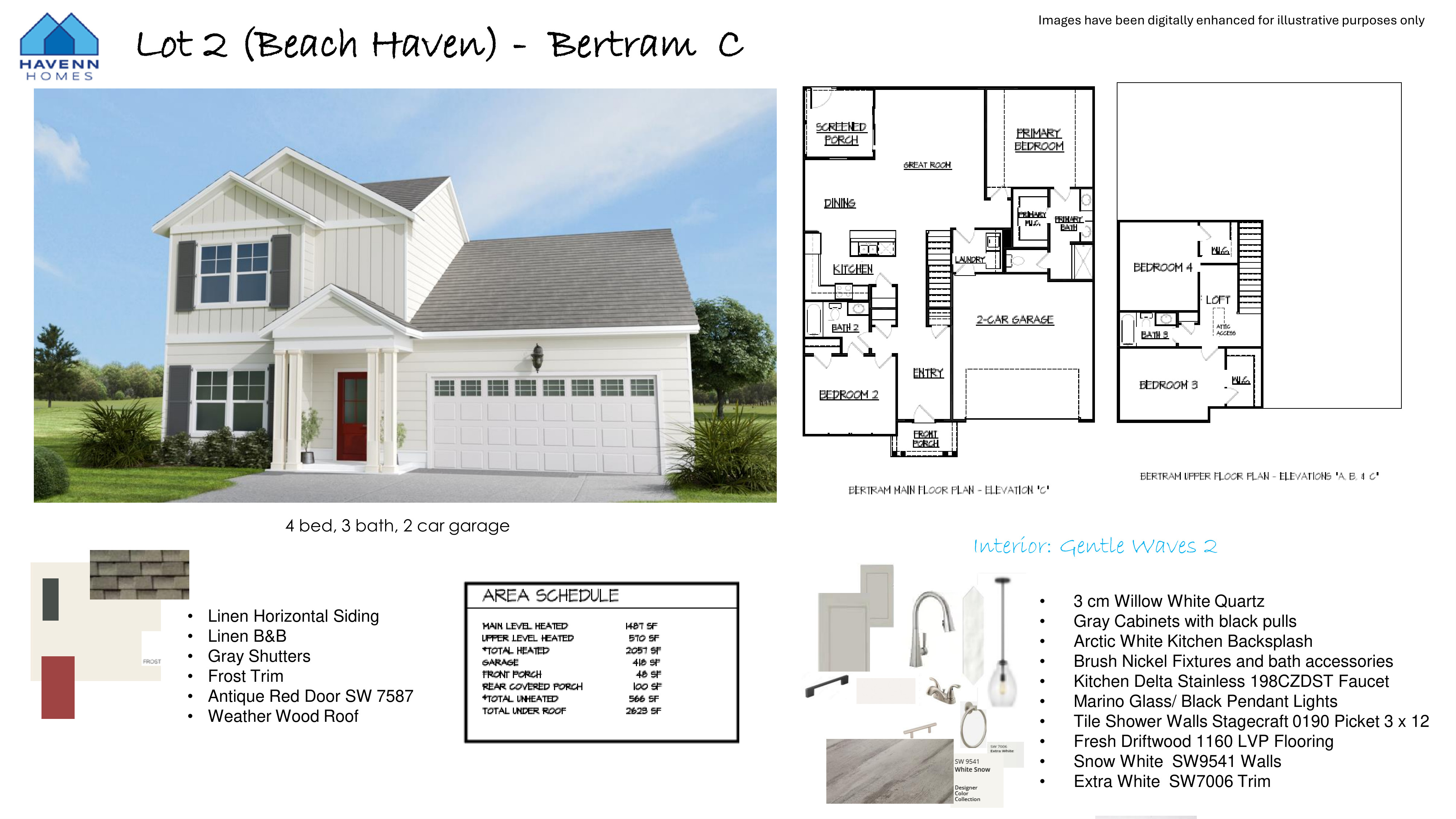 4 bedrooms, 3 bathrooms, 2-car garage, quartz countertops, curated cabinetry, modern fixtures, LVP flooring, tile shower walls, and a classic coastal exterior with an antique red front door.